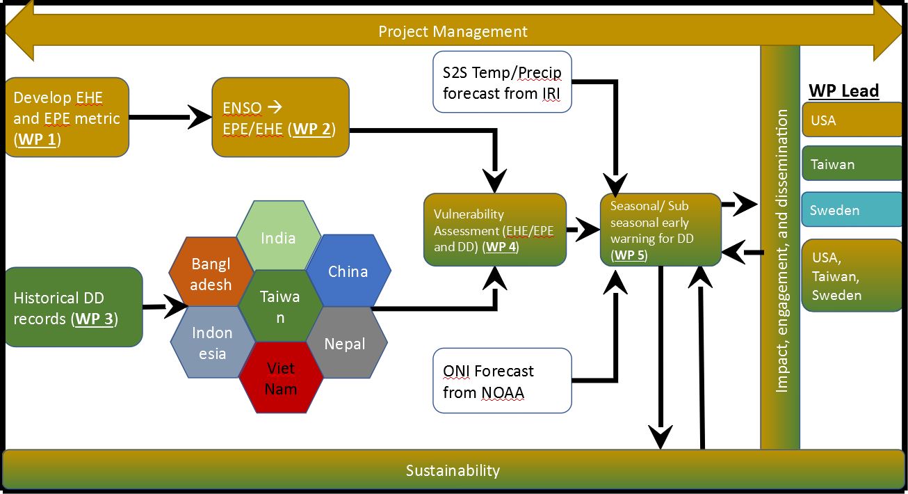 Our interdisciplinary team, led by scientists in the US, Sweden, and Taiwan, will partner with researchers, NGOs, governmental, and community organizations from throughout the Asia-Pacific Region to establish a multinational consortium that will analyze diarrheal disease risk associated with extreme weather events. This focus area was chosen because the Asia-Pacific Region experiences the highest burden of diarrheal disease morbidity globally and includes countries that are considered to be the most vulnerable to climate change. Our consortium will develop a S2S early warning system for diarrheal disease that will be implemented across the region to reduce extreme weather-related diarrheal disease burdens and improve community resilience to climate change. These overall objectives will be achieved by completing various milestones, referred to as Work Packages (WPs).